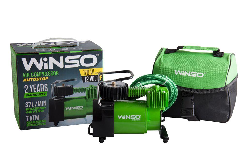 Компресор автомобільний WINSO 7 Атм, 37 л/хв. 170Вт, кабель 3м., шланг 1м., АВТОСТОП. Компресор для накачування шин Winso. Класичний компресор підвищеної потужності. Легкий у транспортуванні, займає небагато місця завдяки невеликим габаритам. Обладнаний манометром. Корпус виготовлений з міцних матеріалів, які захищають компресор від механічних пошкоджень.