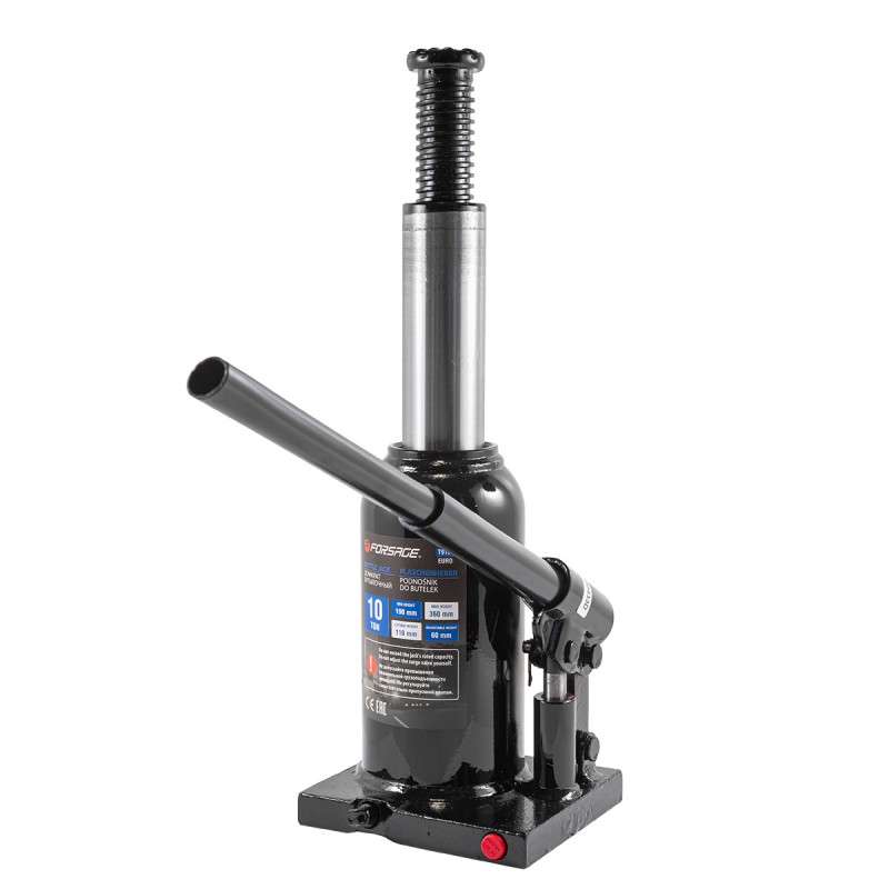 Домкрат гідравлічний пляшковий Forsage F-T91004 використовується для піднімання вантажів масою до 10 т на висоту 190-360 мм. Підходити для автомобілів із високим кліренсом. Домкрат буде корисним для автолюбителів у гаражі та дорозі, а також співробітникам СТО. Переваги Захист від перевантажень - клапан безпеки запобігає підйому вантажу масою понад 10 т.Широкий діапазон застосування - посилений винт дозволяє вручну збільшити висоту підйому на 60 мм. трапецієподібному різьбленню збільшувальний гвинт витримує багаторазове використання. Ремонтопридатність - при необхідності корпус можна зняти зі станини. Захист від корозії – на корпус нанесено фосфатне покриття. Високоякісна всесезонна олія – домкрат безвідмовно працює в широкому діапазоні температур пробку заливного відвернення. Ефективність - чугунна станина забезпечує стійке положення домкрата, складова рукоятка дозволяє проводити роботи в обмеженому просторі та компактно розміщувати пристрій біля зони зберігання.