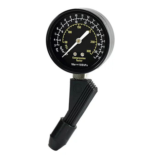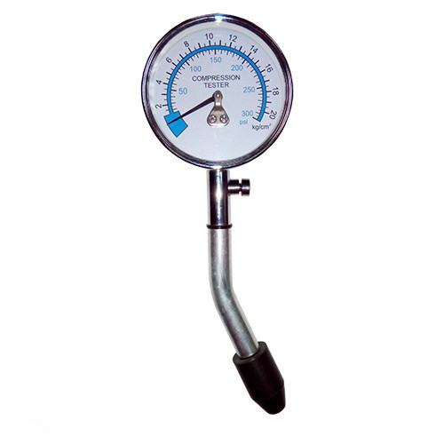 Повна шкала діаметром 2,5". Дві шкали різного кольору: 0-300 psi, 21 кг/см2. Універсальний конічний гумовий наконечник підходить до всіх отворів для свічок запалювання. Простий компресометр натискного типу для виявлення зношених або пошкоджених ущільнювальних кілець, клапанів, та циліндрів.