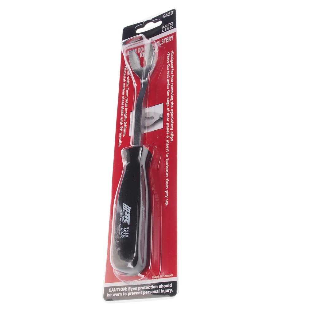 Інструмент призначений для розклинювання скоб внутрішньої дверної обшивки. Завести інструмент під край дверної панелі, вставити в кріплення, а потім підчепити. Матеріал: вуглецева сталь. Ручка зроблена із зносостійкого пластику. Ширина захвату: 7мм. Загальна довжина: 240мм.
